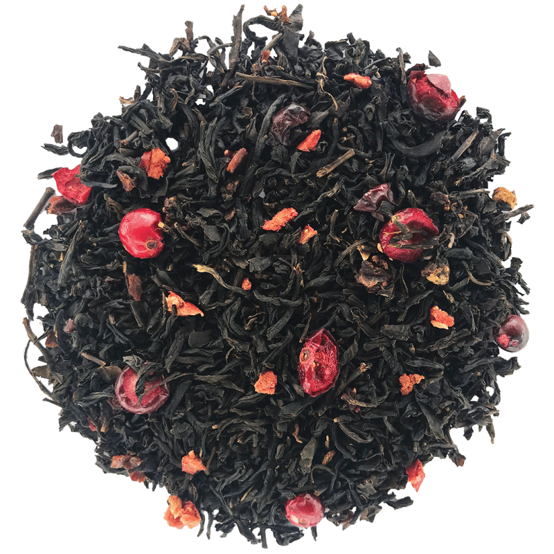 Cette fine récolte de thé, d’apparence noire intense contrastée par la couleur rouge des fraises et des cranberries, ravira les amateurs de thé aux fruits rouges.